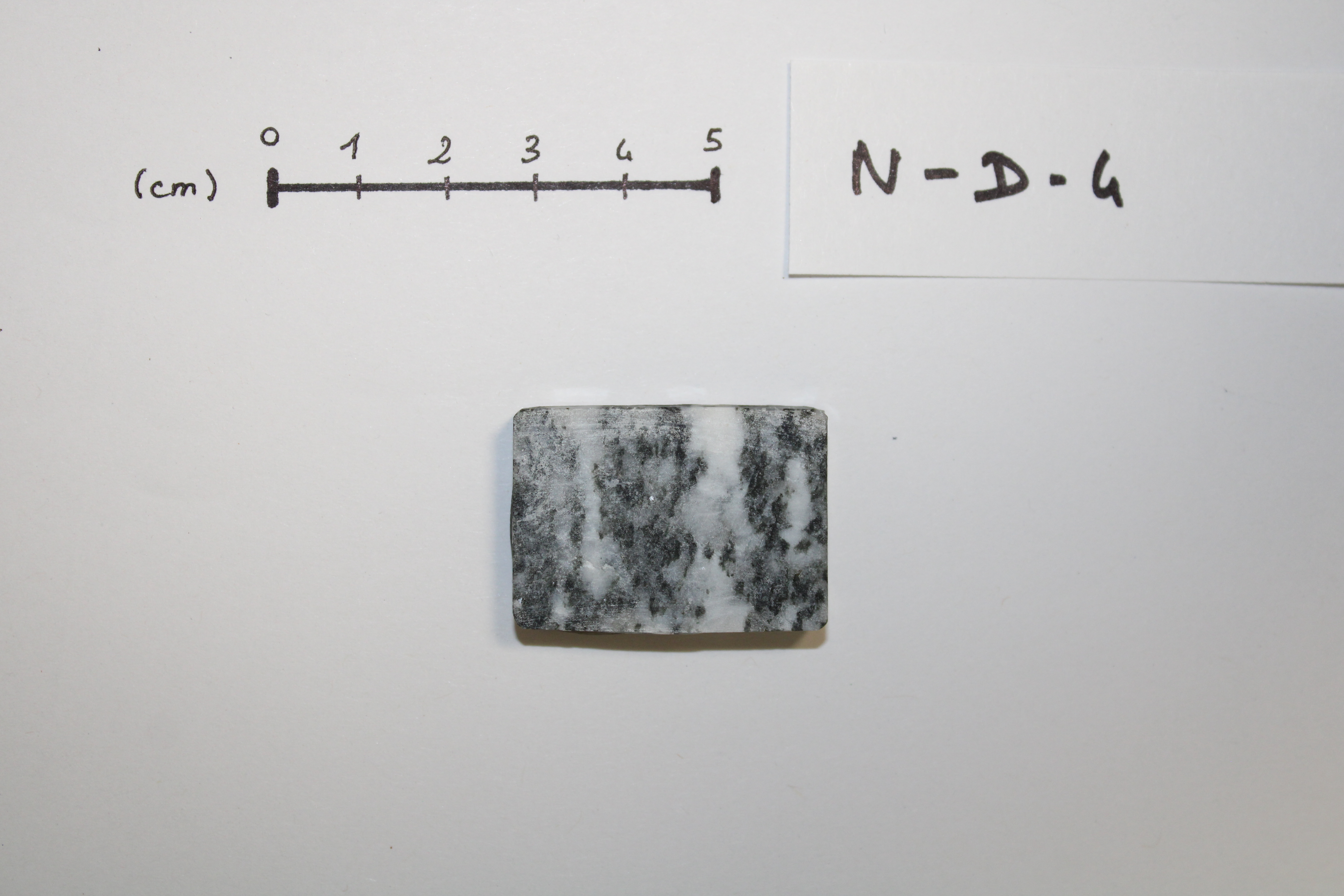 ND4 sample cut in the form of a sugar. This plutonic rock is mainly composed of plagioclase, olivine and serpentine (origin : OMAN).