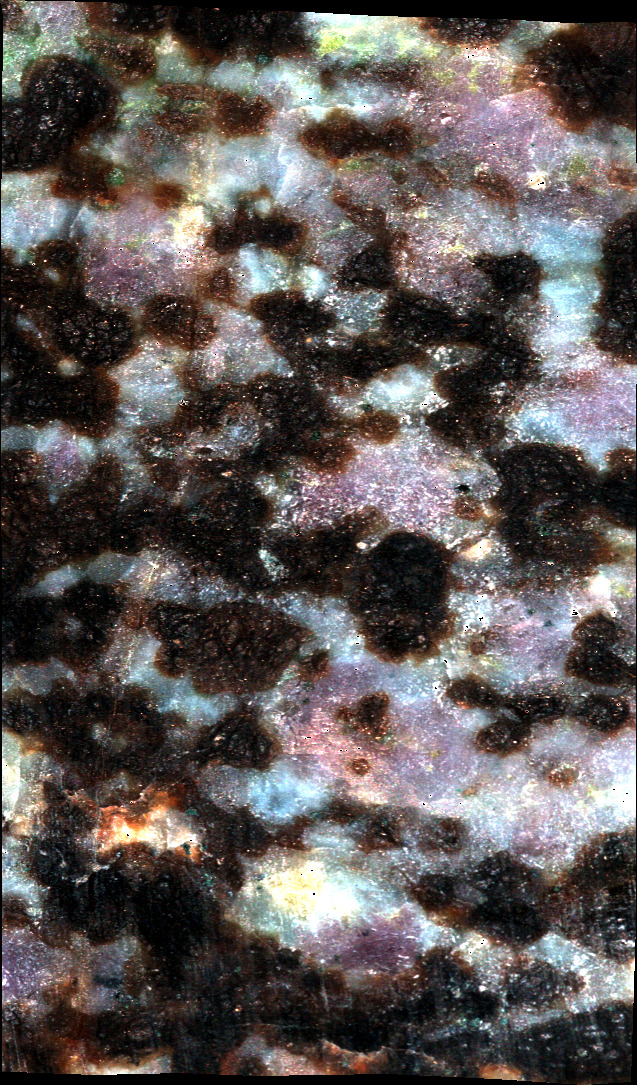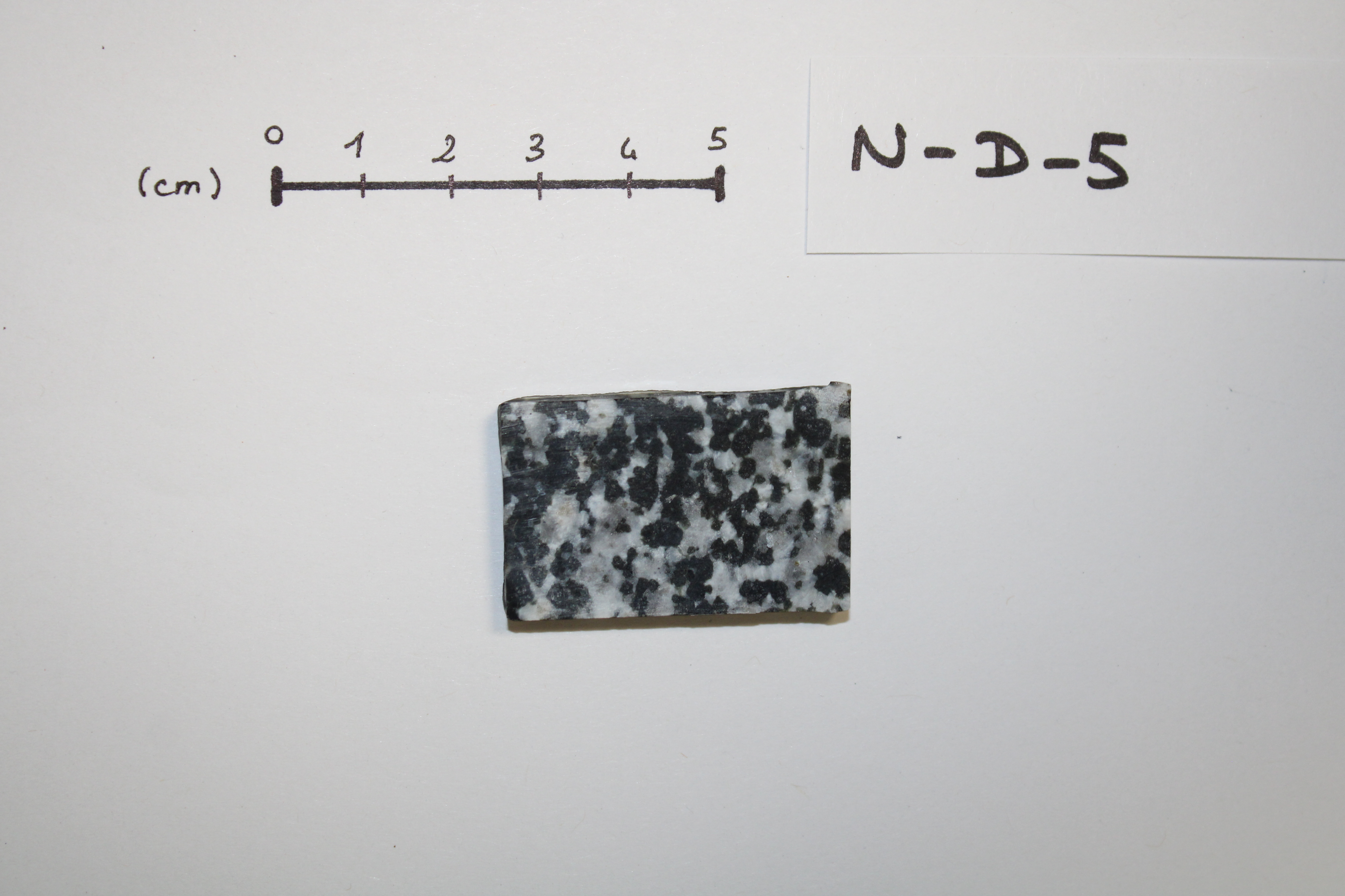 ND5 sample cut in the form of a sugar. This plutonic rock is mainly composed of plagioclase, olivine and serpentine (origin : OMAN).