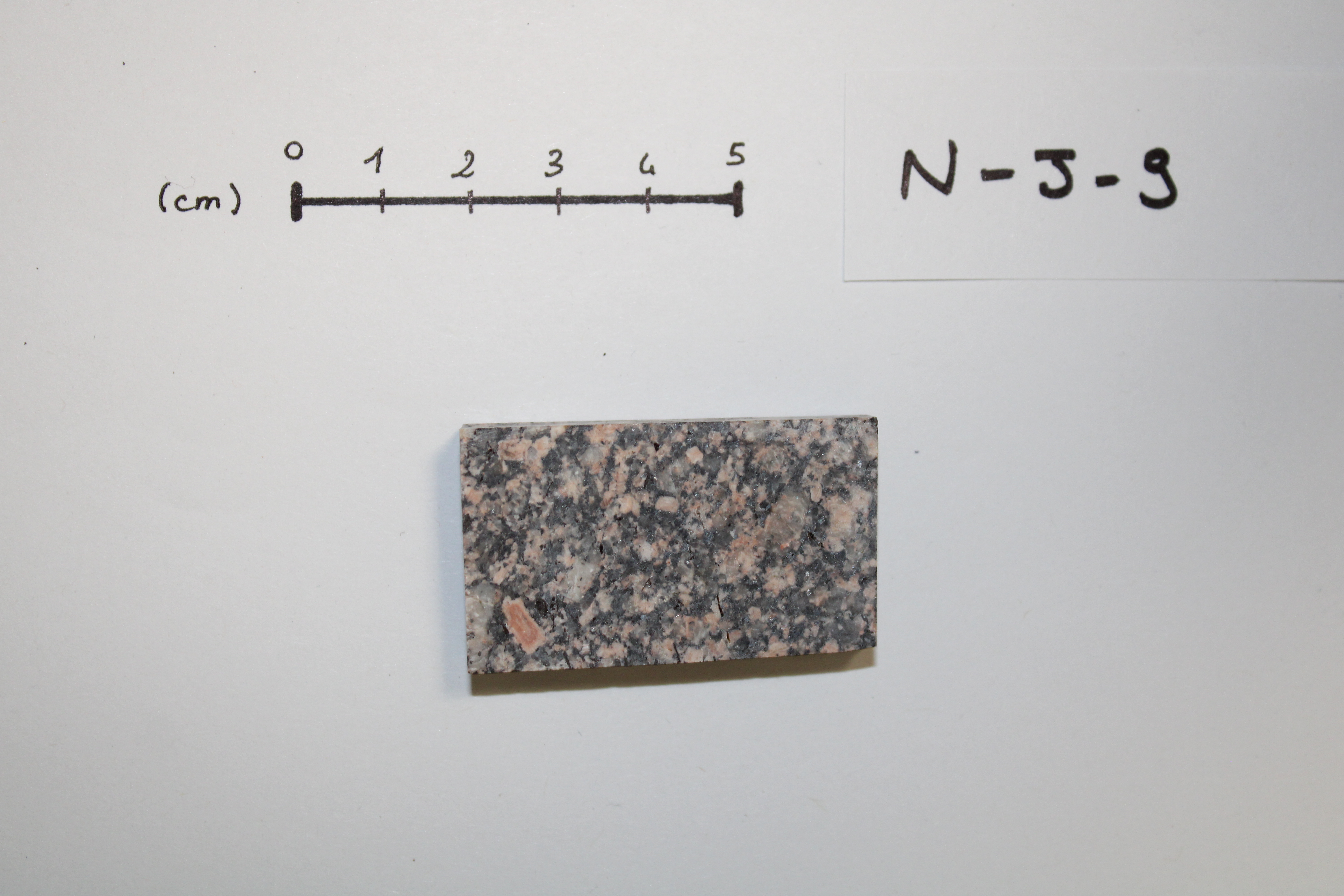 - NJ9 sample cut in the form of a sugar. This plutonic rock is mainly composed of plagioclase, quartz, pyroxene and K-feldspar (origin : Vosges, FRANCE).
