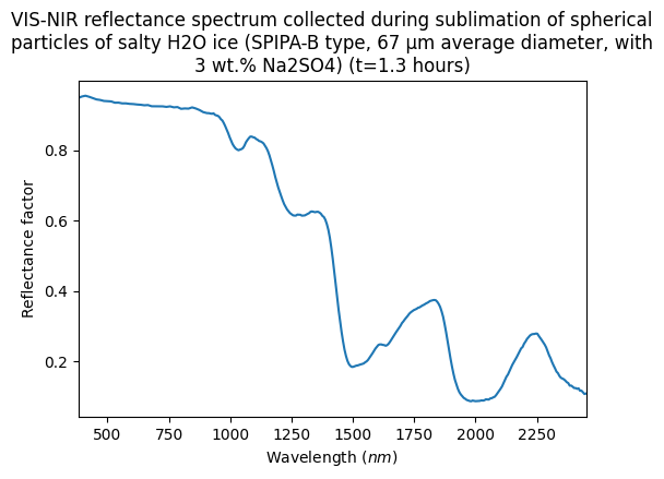 VIS-NIR reflectance spectrum collected during sublimation of spherical particles of salty H2O ice (SPIPA-B type, 67 µm average diameter, with 3 wt.% Na2SO4) (t=1.3 hours)