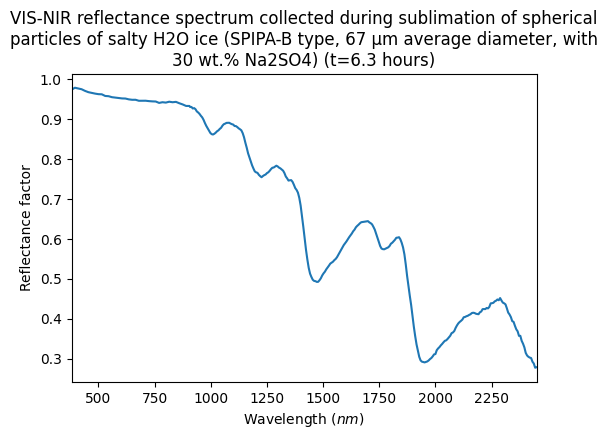 VIS-NIR reflectance spectrum collected during sublimation of spherical particles of salty H2O ice (SPIPA-B type, 67 µm average diameter, with 30 wt.% Na2SO4) (t=6.3 hours)