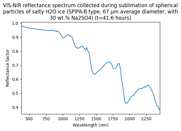 VIS-NIR reflectance spectrum collected during sublimation of spherical particles of salty H2O ice (SPIPA-B type, 67 µm average diameter, with 30 wt.% Na2SO4) (t=41.6 hours)
