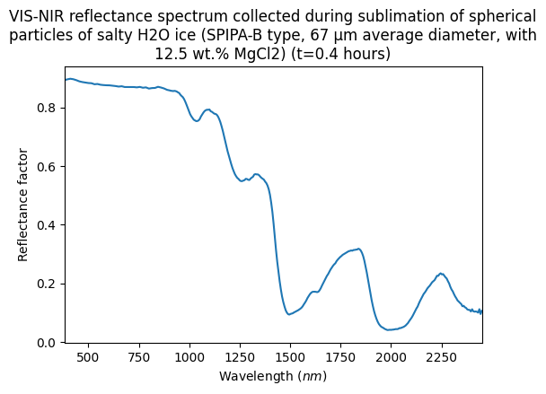 VIS-NIR reflectance spectrum collected during sublimation of spherical particles of salty H2O ice (SPIPA-B type, 67 µm average diameter, with 12.5 wt.% MgCl2) (t=0.4 hours)
