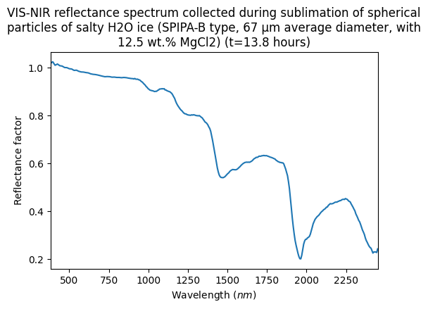 - VIS-NIR reflectance spectrum collected during sublimation of spherical particles of salty H2O ice (SPIPA-B type, 67 µm average diameter, with 12.5 wt.% MgCl2) (t=13.8 hours)