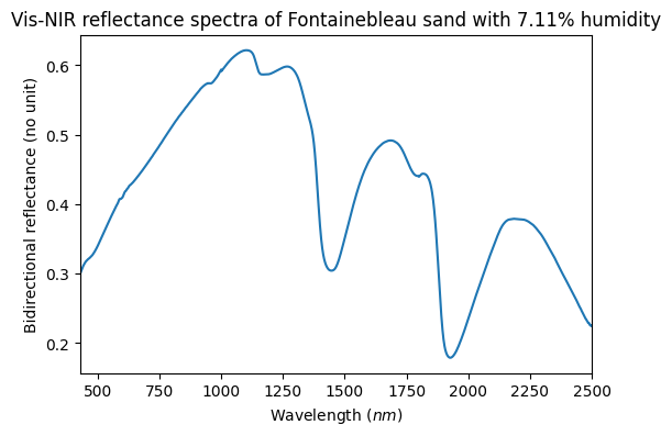 - Carrère, Véronique (2005): Vis-NIR reflectance spectra of Fontainebleau sand wetted with water and dried in ambiant air at 38°C. SSHADE/SSTONE (OSUG Data Center). Dataset/Spectral Data. https://doi.org/10.26302/SSHADE/EXPERIMENT_VC_20050725_001