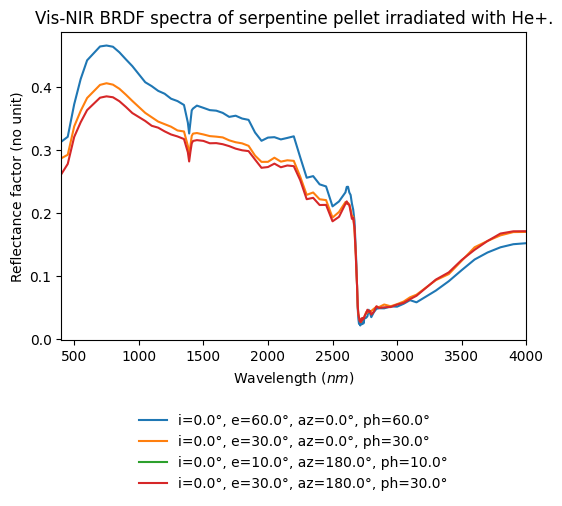 Vis-NIR BRDF spectra of serpentine pellet irradiated with He+.