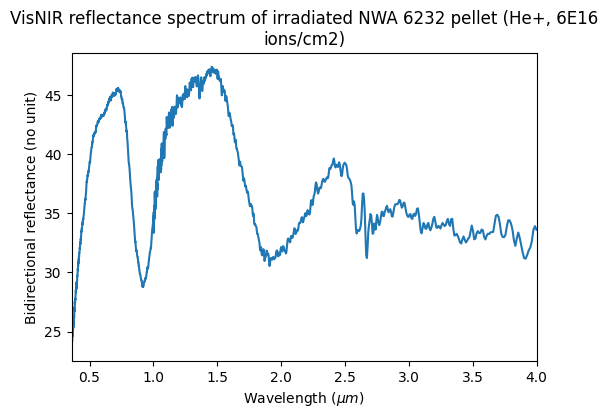 VisNIR reflectance spectrum of irradiated NWA 6232 pellet (He+, 6E16 ions/cm2)