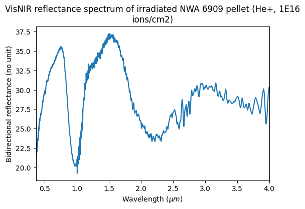VisNIR reflectance spectrum of irradiated NWA 6909 pellet (He+, 1E16 ions/cm2)