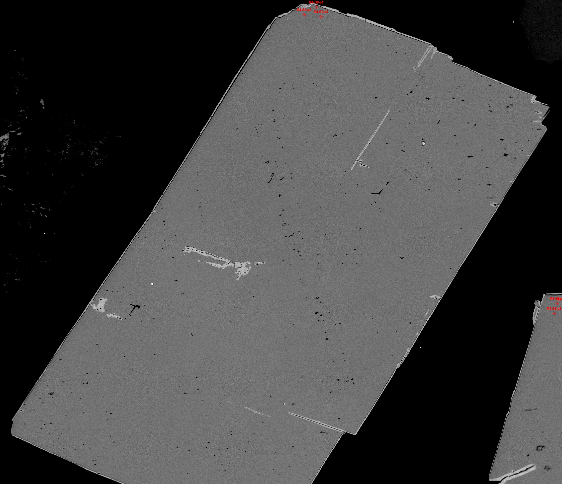very homogeneous grain (1.4 x 2.6 mm) with only little fractures filled with Fe oxides. Included in a finely polished epoxy resin pellet (# M4)