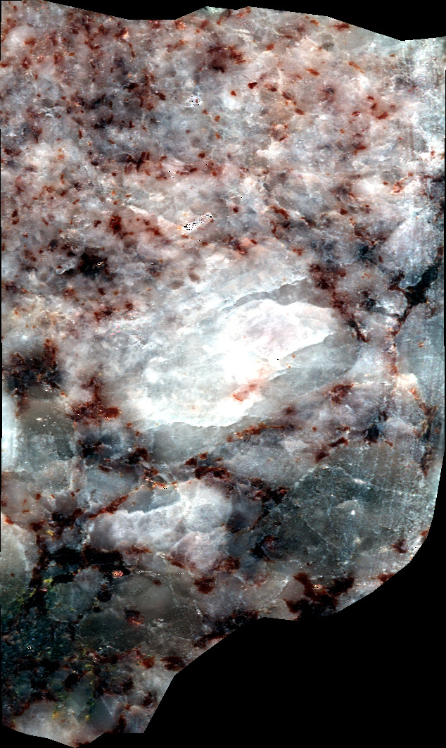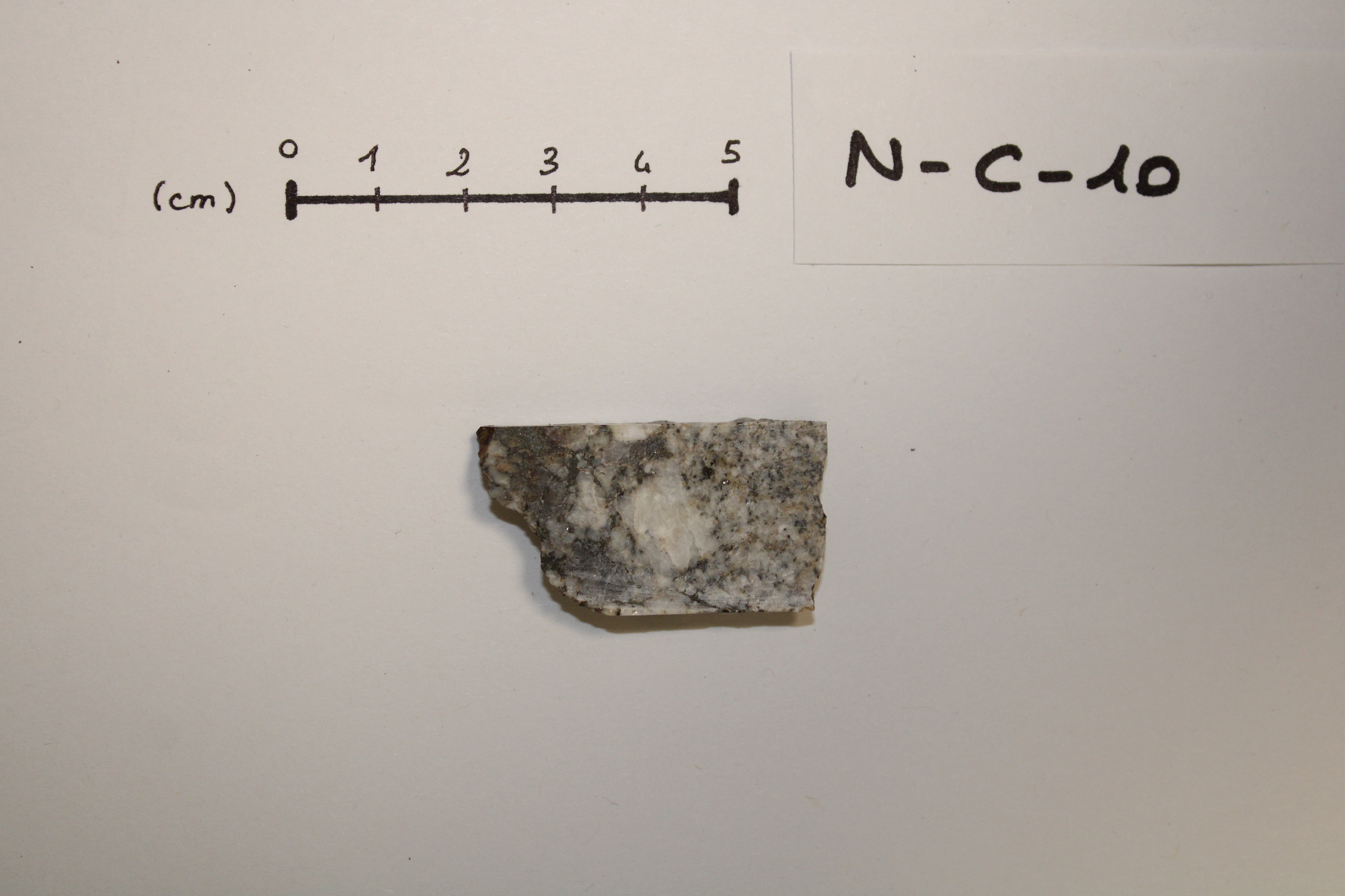 - NC10 sample cut in the form of a sugar. This plutonic rock is mainly composed of plagioclase, quartz, K-feldspar and biotite.