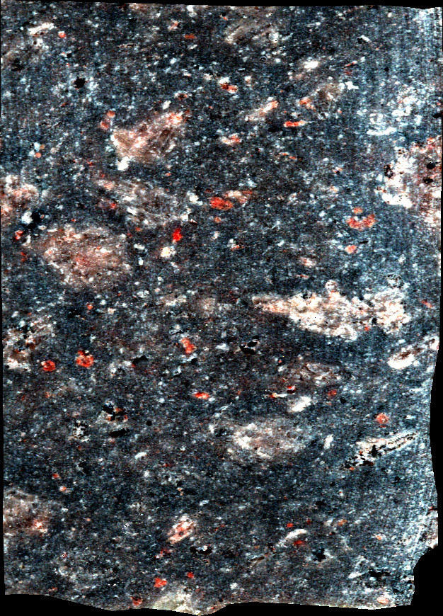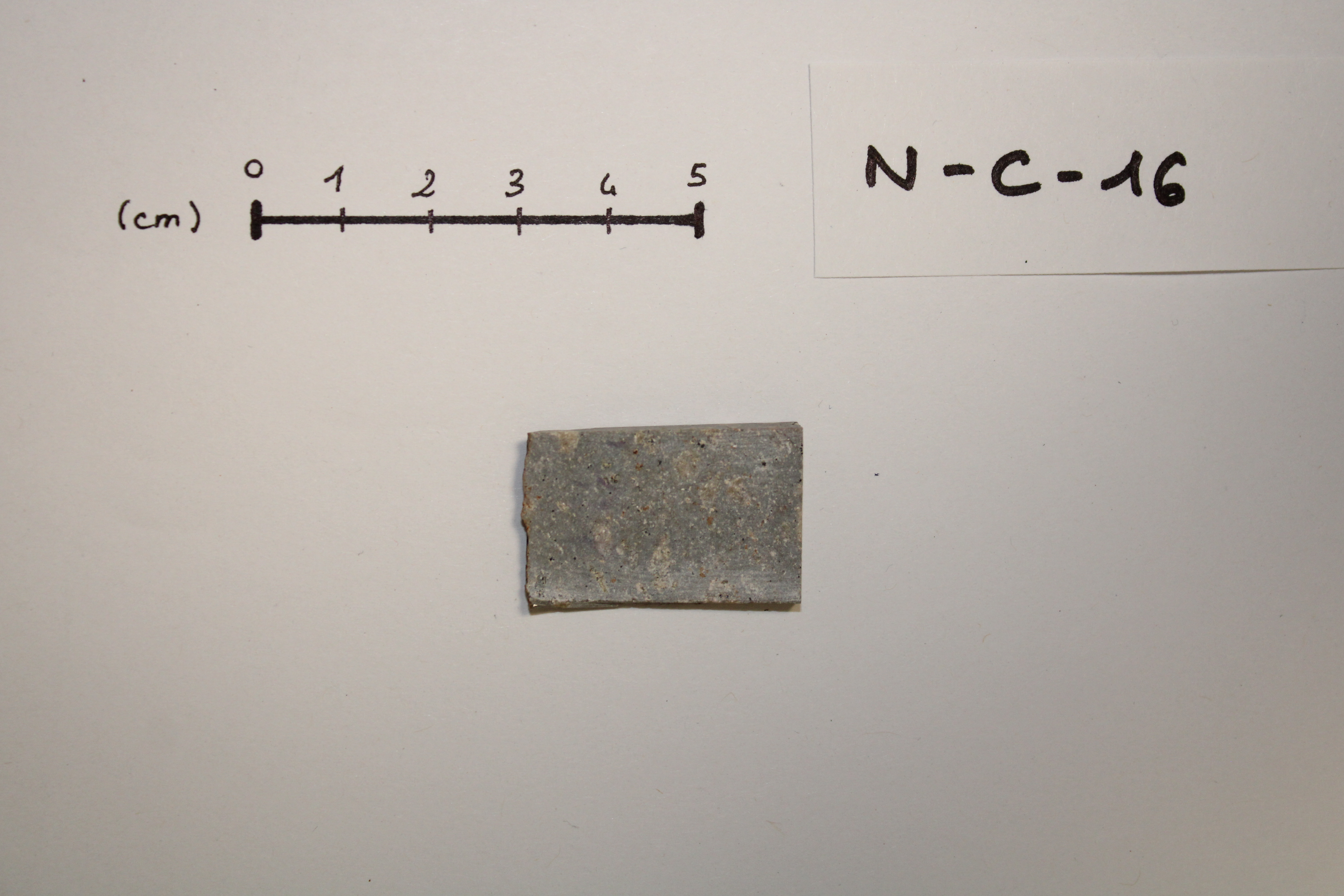 - NC16 sample cut in the form of a sugar. This volcanic rock is mainly composed of plagioclase, and K-feldspar.