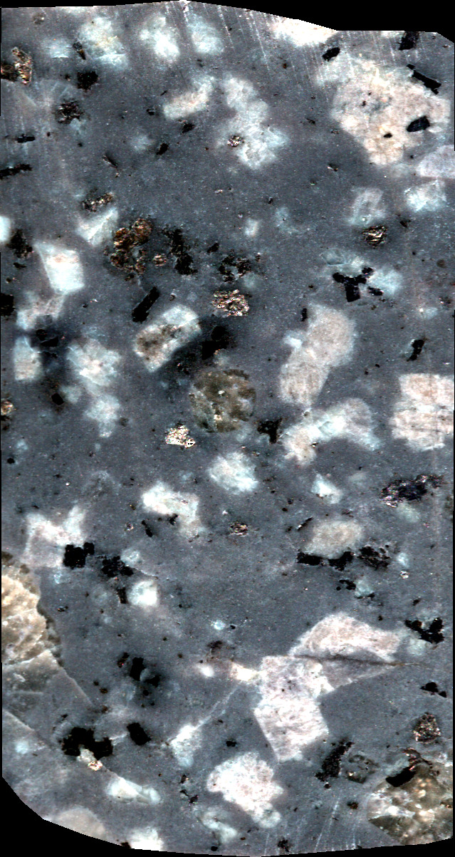- NC1 sample cut in the form of a sugar. This volcanic rock is mainly composed of plagioclase, quartz and biotite.