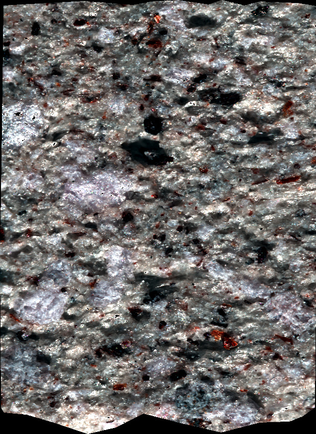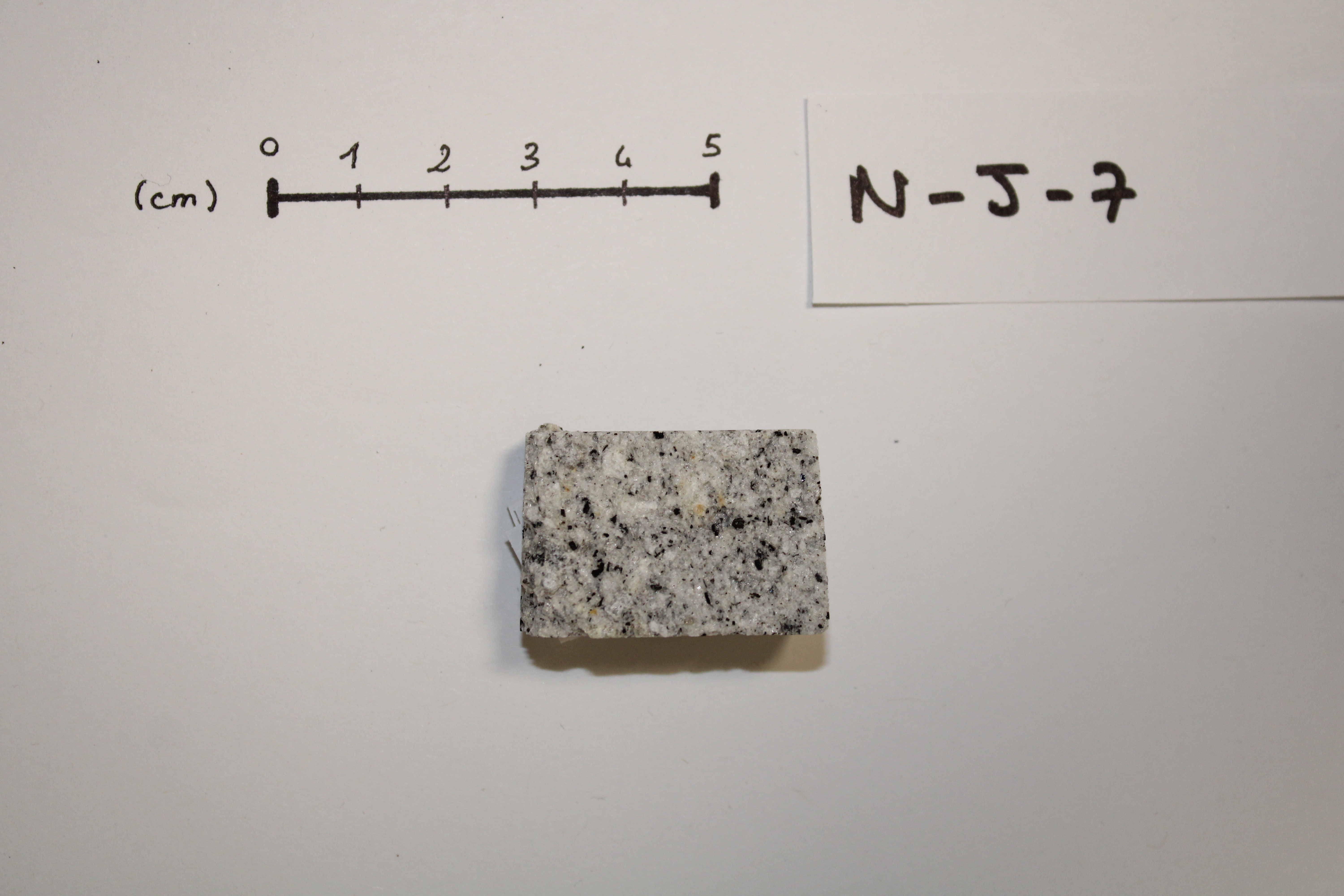 - NJ7 sample cut in the form of a sugar. This volcanic rock is mainly composed of plagioclase, biotite, amphibole and K-feldspar (origin : Atacama, CHILE).